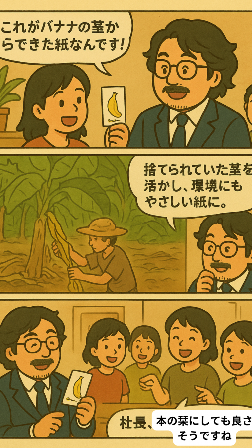そのバナナ愛は棄てられる運命のバナナの茎にも向けられ、「何か役にたてられないものか」ということで紙づくりに乗り出し、完成したのが100%バナナペーパーのバナナフルです。