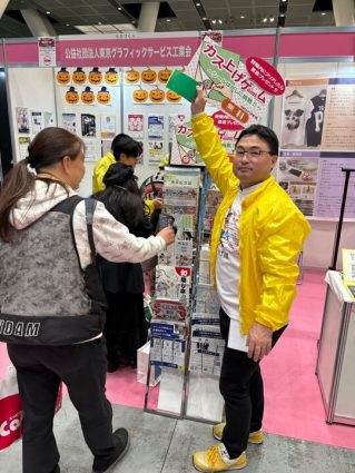 今回はまるなげ課ではなくこの秋リリースしたじむフリ「イベントパス」のPRと、東京グラフィックスのブースの目玉イベントである「カスあげ」の呼び込みで大忙しです。